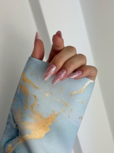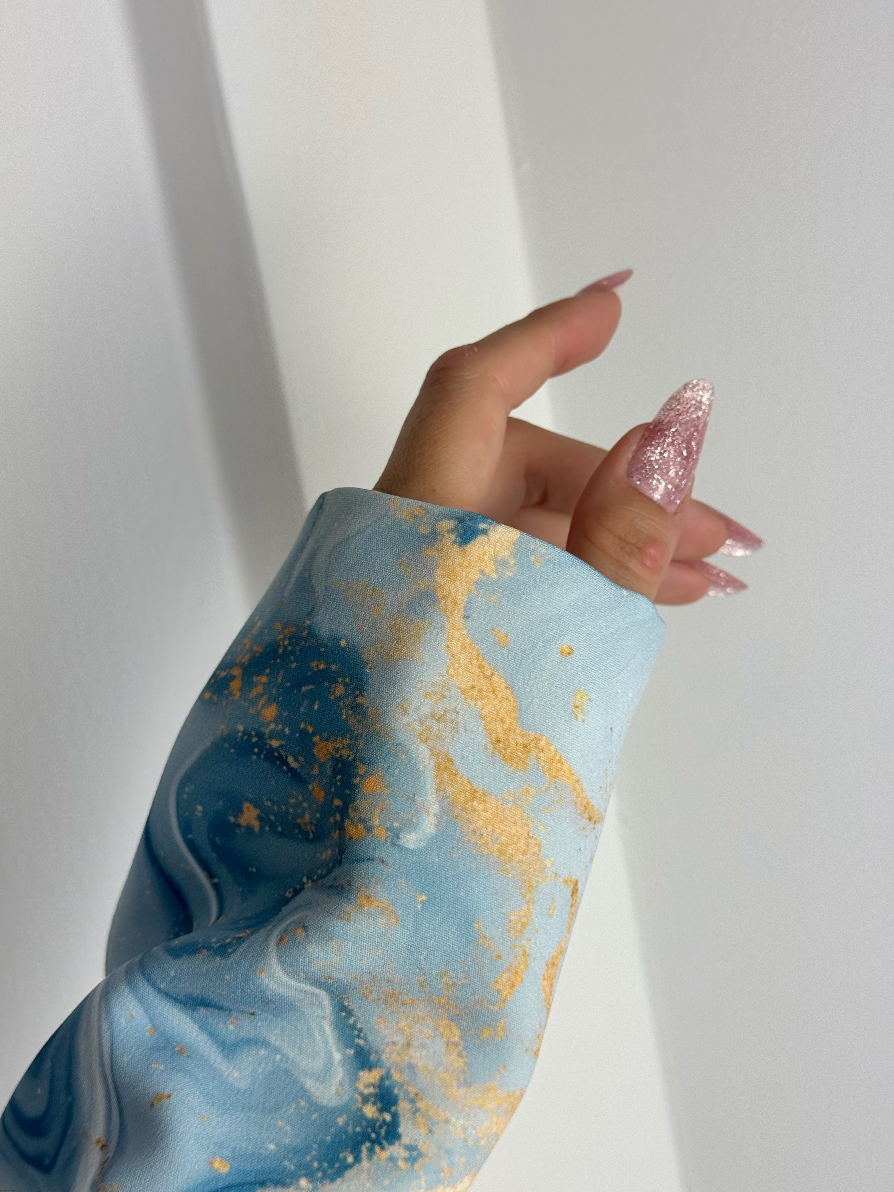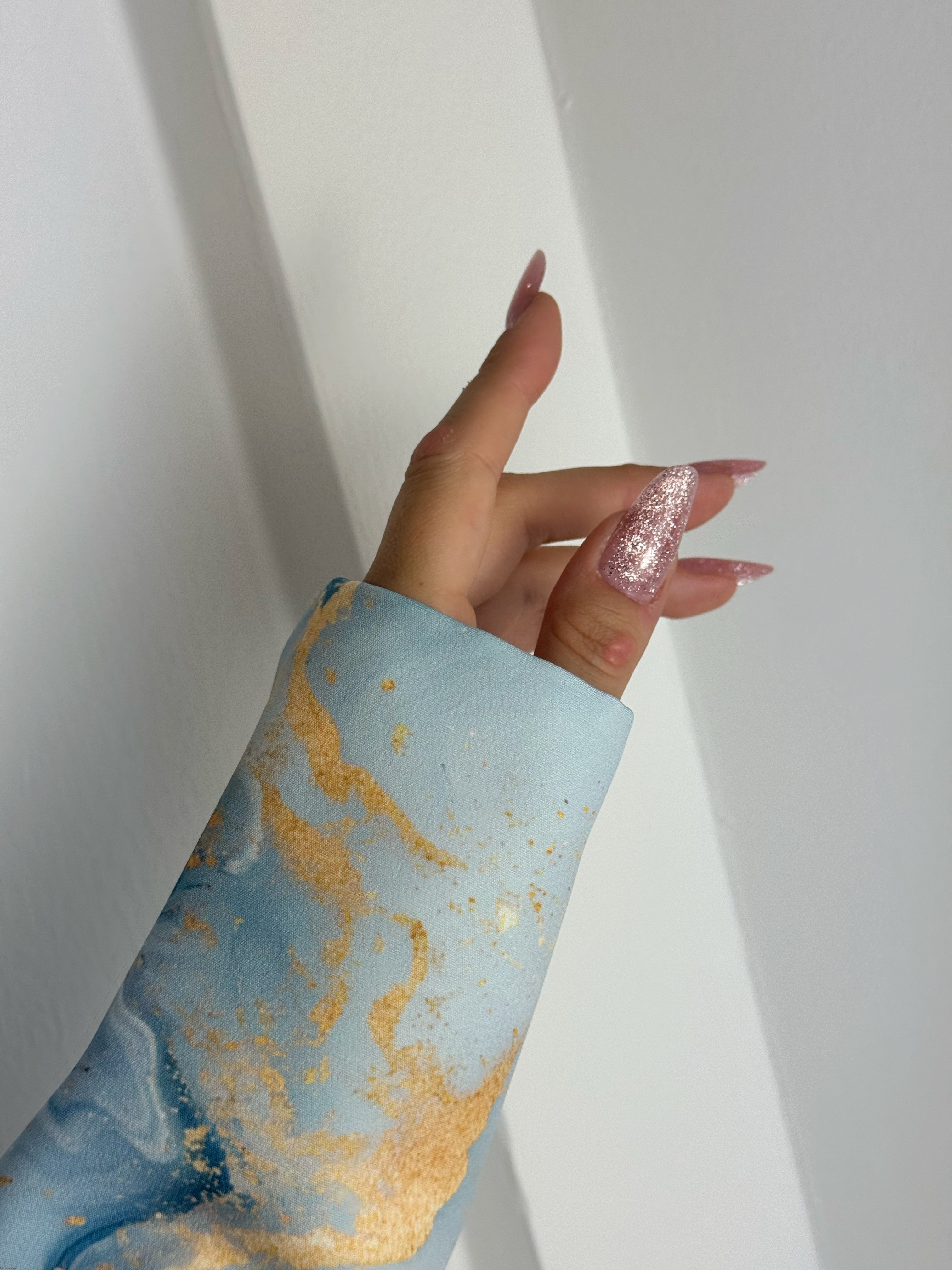 Idealny do sesji zdjęciowych, ten rękaw wprowadza do zdjęć wyrafinowanie i elegancję, stanowiąc doskonałe tło dla piękna paznokci.